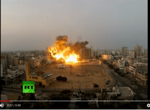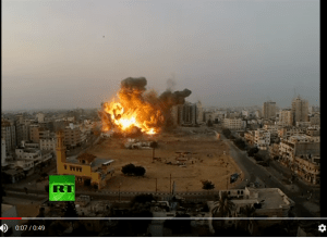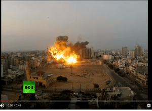 Ceci n’est pas une photo de l’explosion d’une arme israélienne mais bien l’explosion d’un petit réacteur souterrain (et sa cheminée dans le bâtiment en bas du “terrain vague”). This is not what the Israelis used to bomb the arsenal but the explosion of a secret nuclear plant. The square looks a bit “fake” and the cooling tower is obvious.”Israeli missiles hit the headquarters of the Palestinian National Security Forces. The air strike caused a huge explosion, leaving one building in flames. […]” – The title of the video confirms what I say, it is “Huge blasts in Gaza…” Le titre de la vidéo le confirme. We see the main explosion comes from the underground, not from above, the blast starts under the ground. Pebble bed reactor I think.