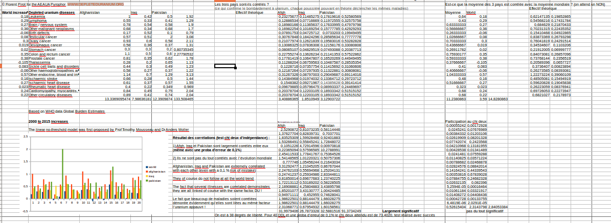 Ci dessous une démonstration statistique du modèle linéaire sans seuil pour les émetteurs alpha en contamination interne avec les bombardements à uranium appauvri en Irak, Afghanistan, Pakistan. Below, statistical demonstration of the linear no threshold model with depleted uranium bombings in Afghanistan, Pakistan, Iraq (alpha emitters, internal contamination).