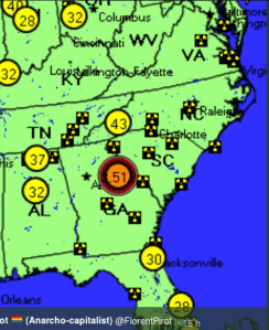 The radioactivity in the main beacon I’ve followed eventually quickly decreased, to 3150 CPM, then 650 CPM, then back to normal in a few minutes. Another beacon showed a very abnormal reading (the Raleigh thin-lined showed 95, which is 285 in the scale of the first – remember that fat-lined (“pancakes”) have to be divided by 3 to reach thin-lined levels). All of this in a few minutes (I had to “screenshot” twice, leaving out timestamp, but it was because of the need to have an immediate response). I had to sleep and may have missed the next steps of the huge cloud but it was traveling very slowly and I could not wait.