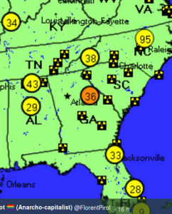 That’s 31 microSv/h. Checking with winds confirms perfectly that this area was under the winds coming from the Brunswick nuclear reactor.