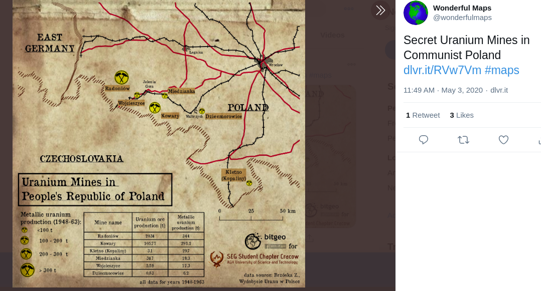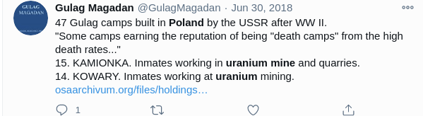 Evidemment, les services secrets du Bund cherchaient seulement, dans les années 1960, à faire quelque chose de légitime, dénoncer la confusion entre le nazisme et les nouveaux camps d’extermination modèle soviétique installés en Pologne socialiste : les mines d’uranium dont j’évoque déjà l’existence dans La solution finale par le travail forcé, lorsque l’uranium remplace le Zyklon B et sur ce site Web, bien sûr. J’ai en effet quelques documents supplémentaires sur celles des mines d’extermination qui se trouvaient en Pologne, les voici. Le second document présente une cartographie qui n’inclut pas Kamionka, qui a certainement eu trop peu de survivants, mais observez déjà le gros chiffre de Kowary.