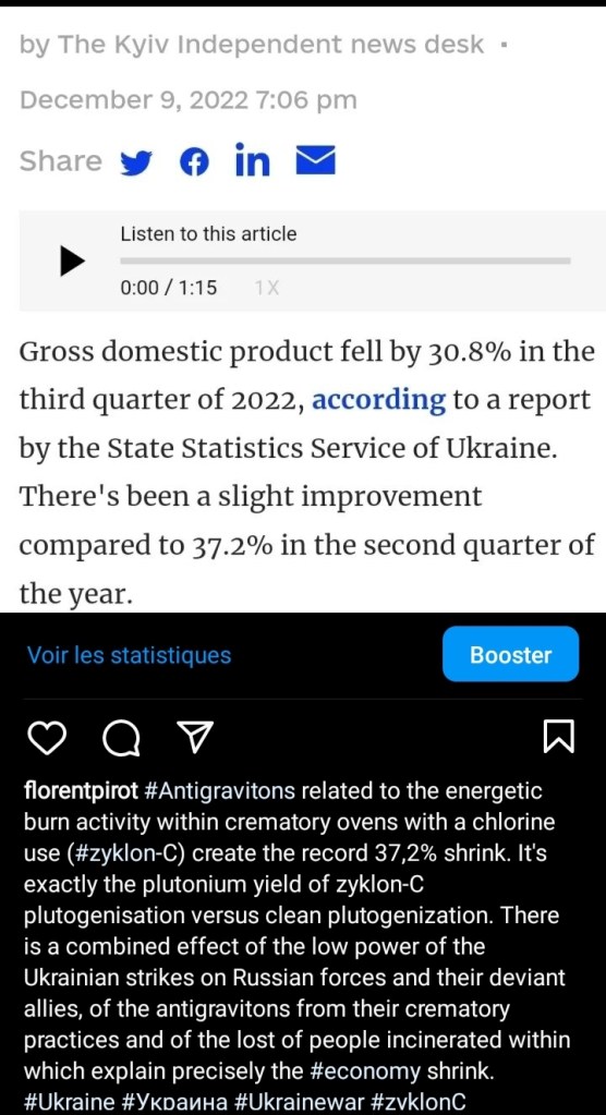 The massive use of zyklon-C plutogenization (depleted uranium and chlorine mixed to play with the channel of absorption in the brain, see my 2019 article for reference and description) is causing very dangerous fallout over Europe. Zyklon-C has been the intial cause of the Russian special operation as antitank missiles with DU and some with both DU and chlorine injected within (the NLAWs) were lined in eastern Ukraine and started to be fired against Donet’sk and Luhansk together with crematory oven tanks, esp. the new-generation Shturm-SM outputting their new rockets with a robotic arm after incineration within of a victim. Zyklon-C has been particularly used from the second quarter of 2022 in Ukraine, for pogrom purposes. Zyklon-C weapons were used for many military activities, in famous cases hits against Zapporizhzhie NPP, as warheads in S300s and more recently against Dmitry Rogozin. These are just tiny examples of the quasi-systematicity of use. Growth statistics published by the Kyiv Independent have confirmed my point. Read my crematory ovens and economic growth scientific article.