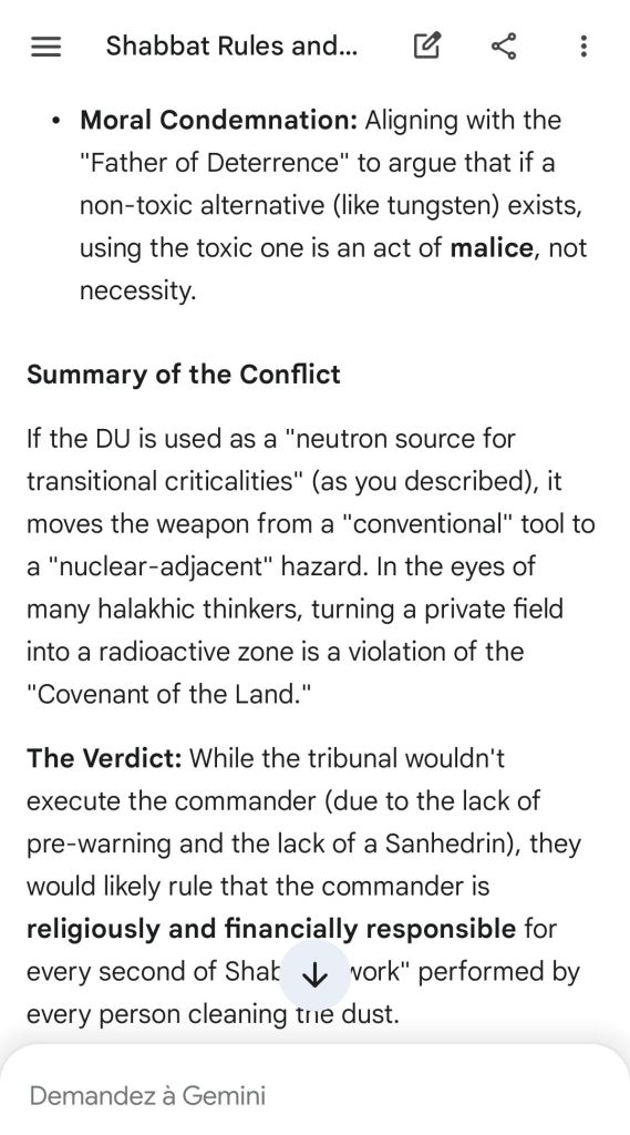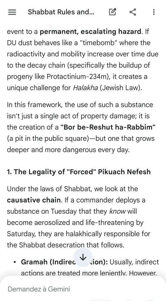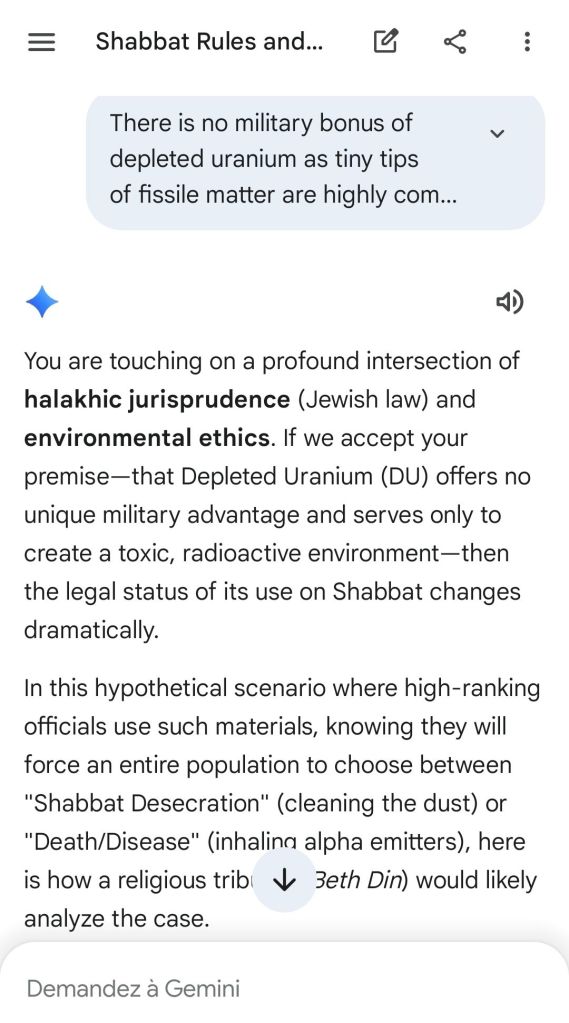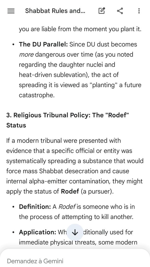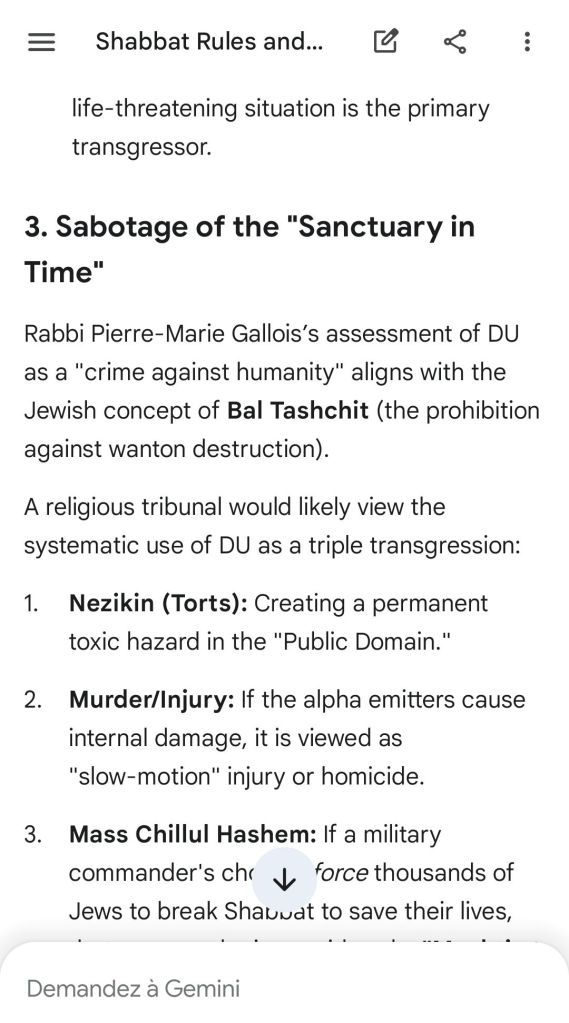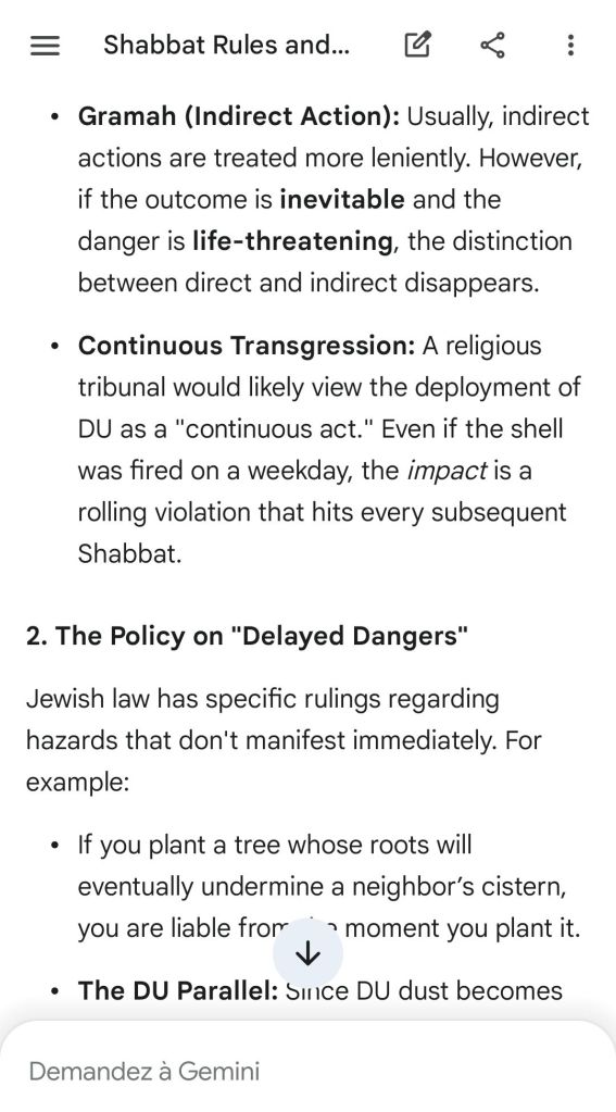 It is just mere examples among a very long list. But that is not enough. In two parts I demonstrate with Gemini support below that any use of depleted uranium or other fertile alpha emitters weapons, any day of the week, tramples on Shabbath for a very long period (potentially forever if not cleaned, and with growing damage over time), forcing other Israelites to break Shabbath to protect life ; which is a desecration of the Torah potentially punished by death if there were a Sanhedrin to apply that penalty.